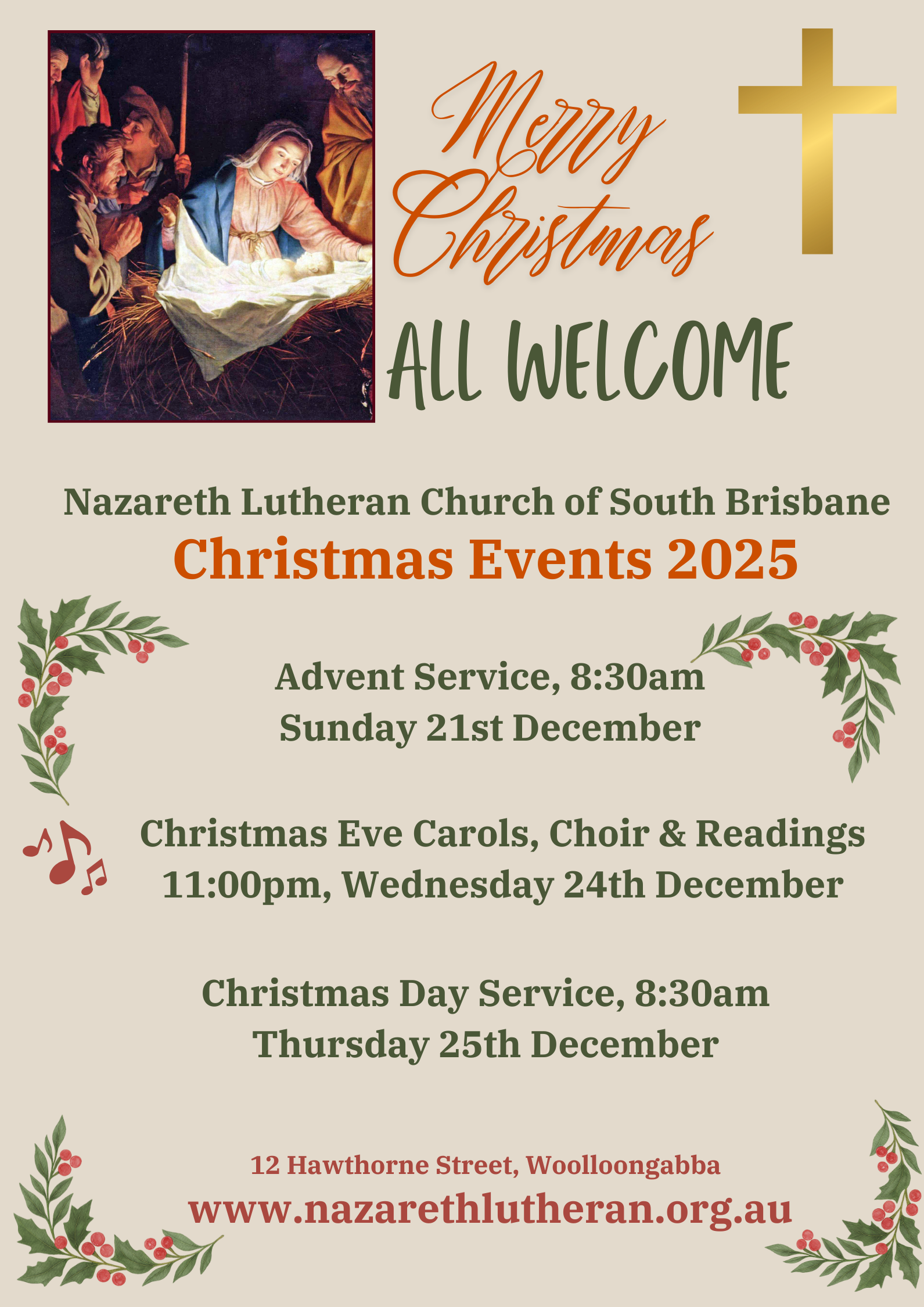 You’re invited to join in our singalong Christmas Eve Service with Christmas Carols, a Choir and Readings, from 11pm on Christmas Eve, Wednesday 24th December, at our Church at 12 Hawthorne Street, Woolloongabba. See our Christmas Schedule flyer below.