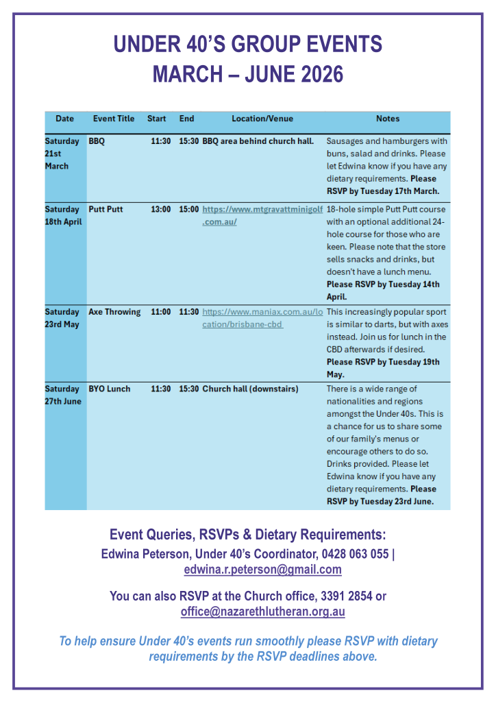 Nazareth Under 40’s Group events are open to members of our congregation and other Lutheran congregations who are under 40 years of age.